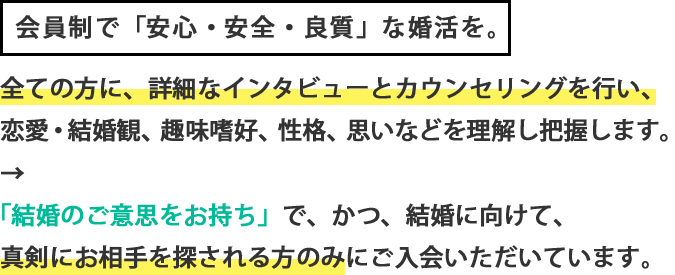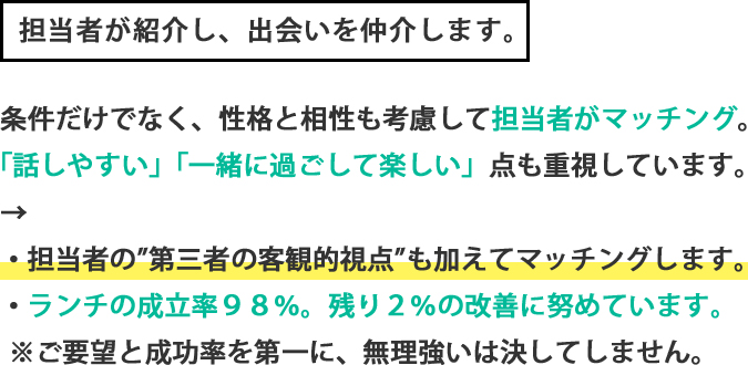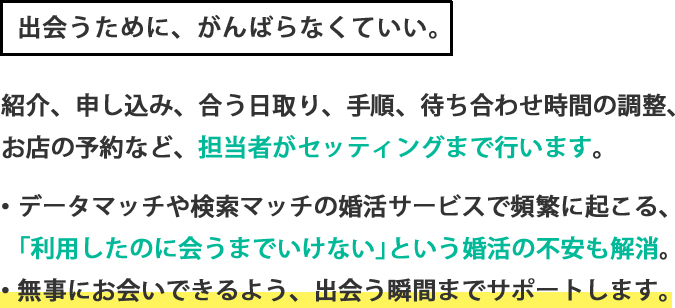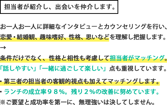 直接あなたのお話をお聞かせいただいた上で、合いそうな方をご紹介可能か、お伝えをさせていただいています。