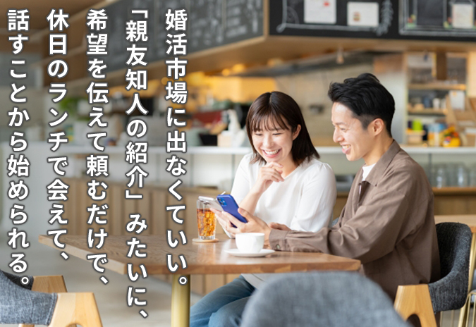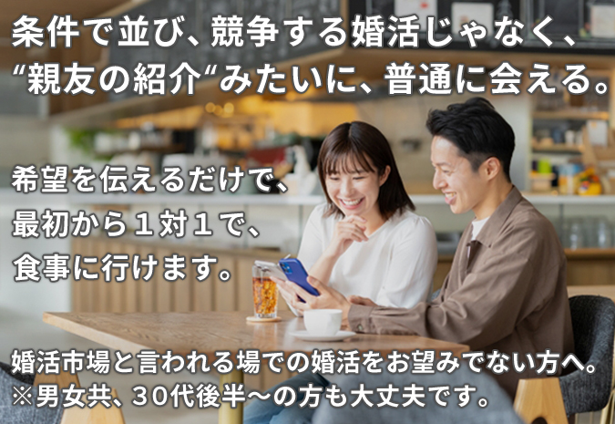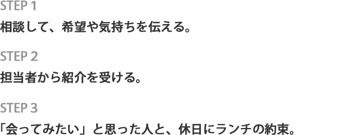 直接あなたのお話をお聞かせいただいた上で、合いそうな方をご紹介可能か、お伝えをさせていただいています。