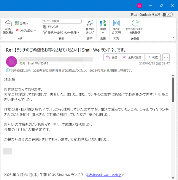 この度、結婚が決まりましたので、ご報告と退会したく連絡しました。